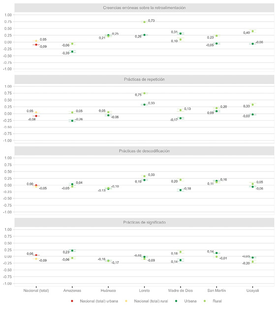 A pesar de este contexto complejo, la literatura evidencia la existencia de factores escolares que pueden mitigar estas limitaciones. Entre ellos, la formación pedagógica del docente destaca como un elemento decisivo: contar con un profesor titulado se asocia positivamente con el aprendizaje en lectura, especialmente en la Amazonía (Minedu, 2016b). Asimismo, prácticas pedagógicas centradas en la simple repetición de información se relacionan con desempeños más bajos —con un efecto más marcado en la sierra y la selva—, mientras que aquellas orientadas a la construcción del significado se asocian con mejores resultados (Minedu, 2016b, 2024b). La evidencia también señala que estudiantes cuyos docentes cuentan con estudios de posgrado suelen alcanzar mejores logros en distintas áreas (Minedu, 2016b).